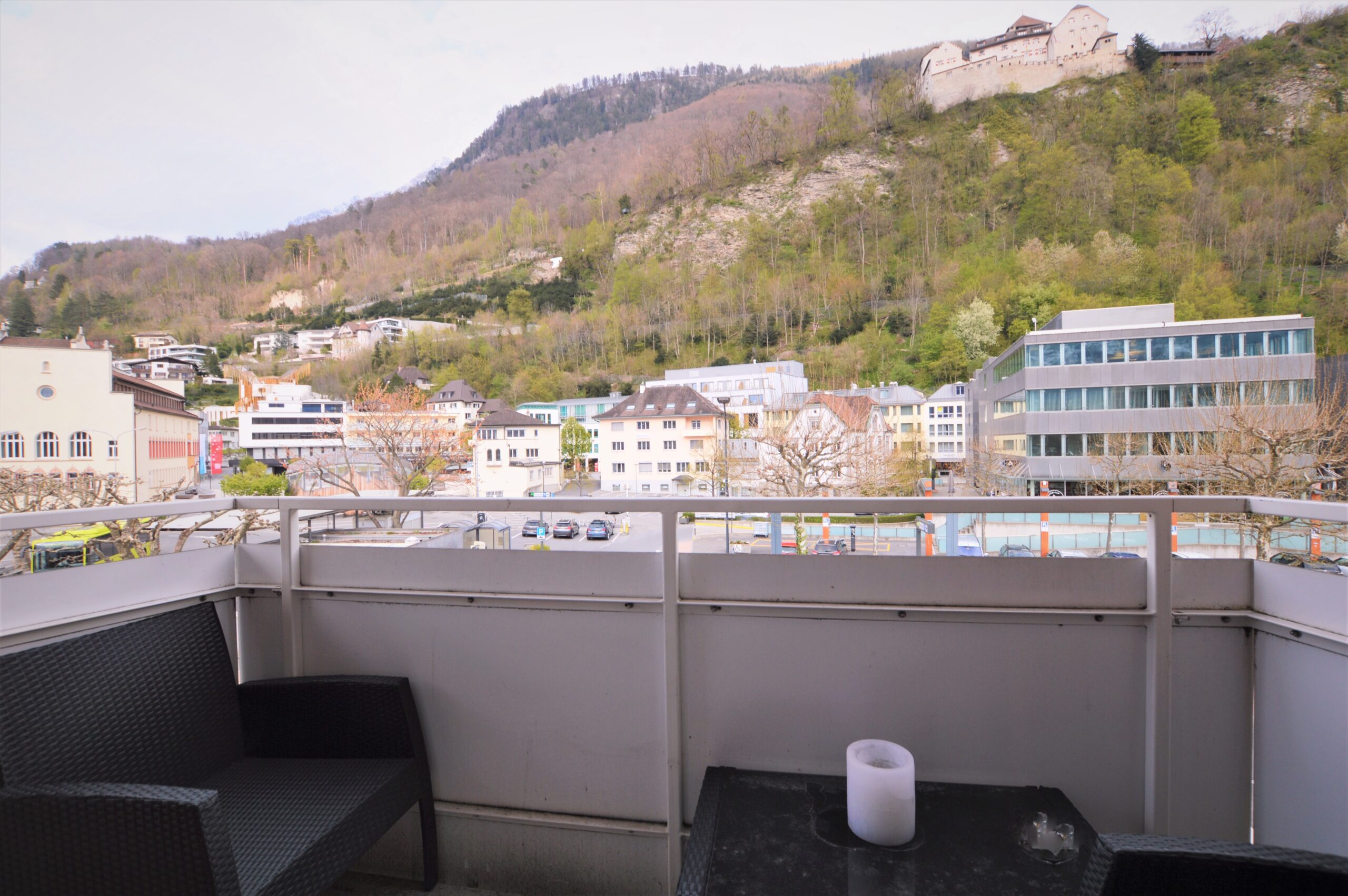 - kleiner Balkon mit Aussicht auf das Schloss